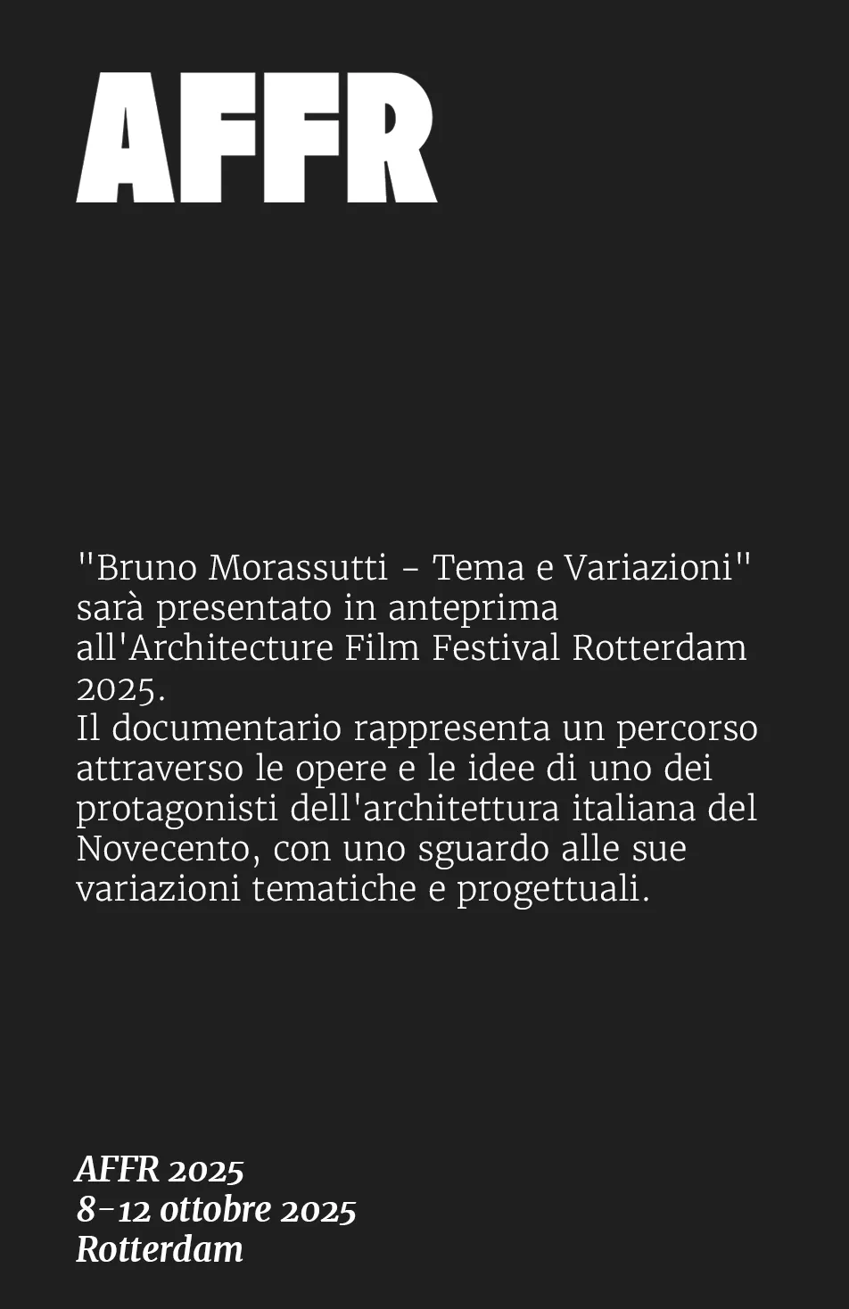 Non è facile tracciare un ritratto di Bruno Morassutti, architetto italiano colto e sensibile, ma anche riservato e schivo. Padovano di nascita, laureato allo IUAV di Samonà, uno dei pochissimi italiani ad aver frequentato a Taliesin la scuola di Wright, ha attraversato il novecento con il suo metodo di progettazione al tempo stesso rigoroso e brillante. Il film ricostruisce il suo lascito umano e professionale attraverso le testimonianze di amici e collaboratori, grazie ai preziosi materiali di studio e alle riprese nei suoi suggestivi edifici. La narrazione si snoderà attraverso diverse location, da Milano a Madrid alle Alpi Italiane, seguendo il filo che tiene insieme una carriera durata 60 anni e progetti dalla scala domestica alle grandi infrastrutture, tutti accomunati dalla lucida visione di chiarezza strutturale e libertà estetica.